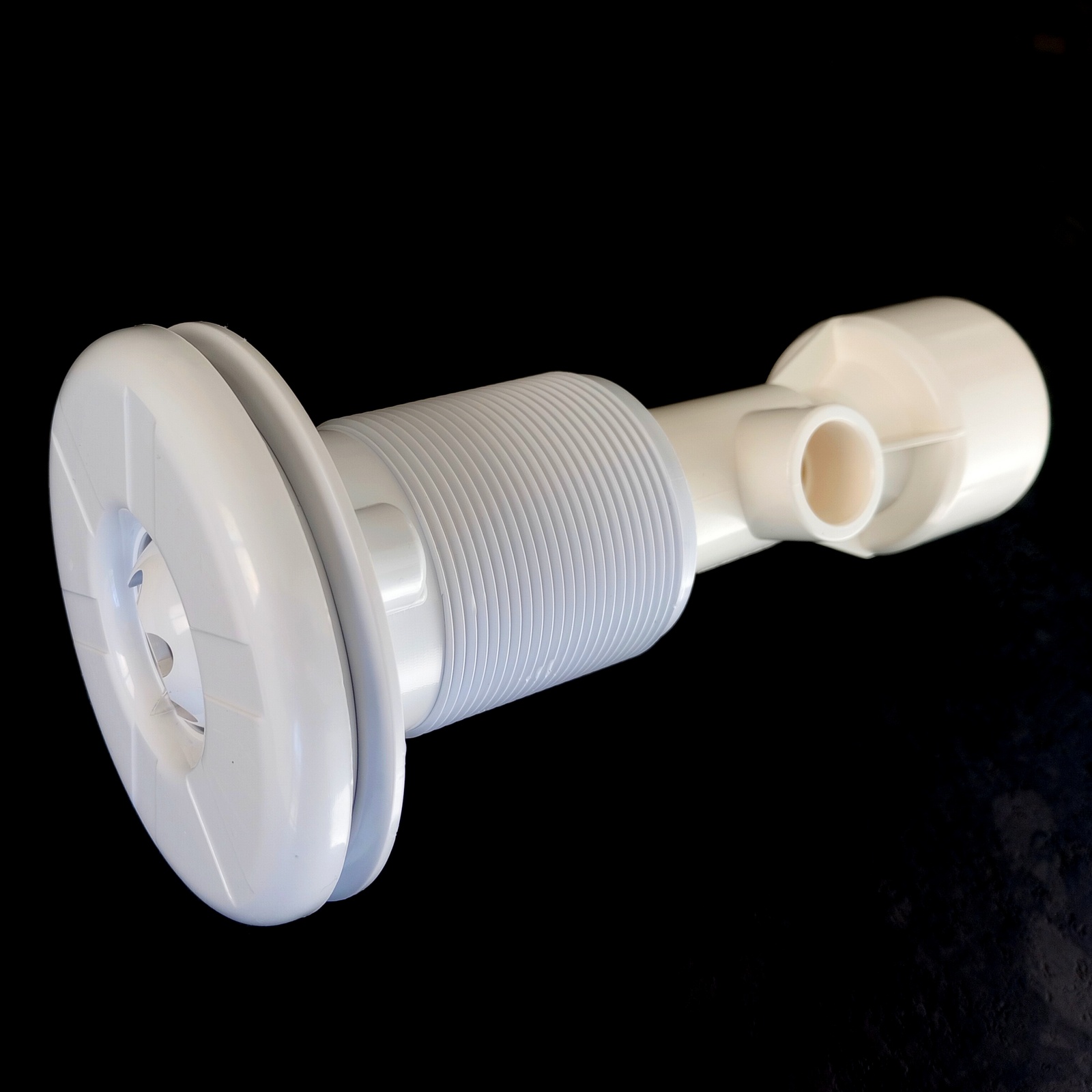 Il kit bocchetta idromassaggio, miscela l’aria e l’acqua tramite un dotto venturi integrato, completa di passaparete, ha una lunghezza di 18,5 cm.