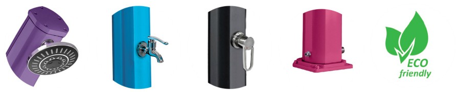 La doccia è realizzata interamente in alluminio verniciato a forno, dispone di un ampio soffione effetto pioggia, un miscelatore per regolare la temperatura dell’acqua.